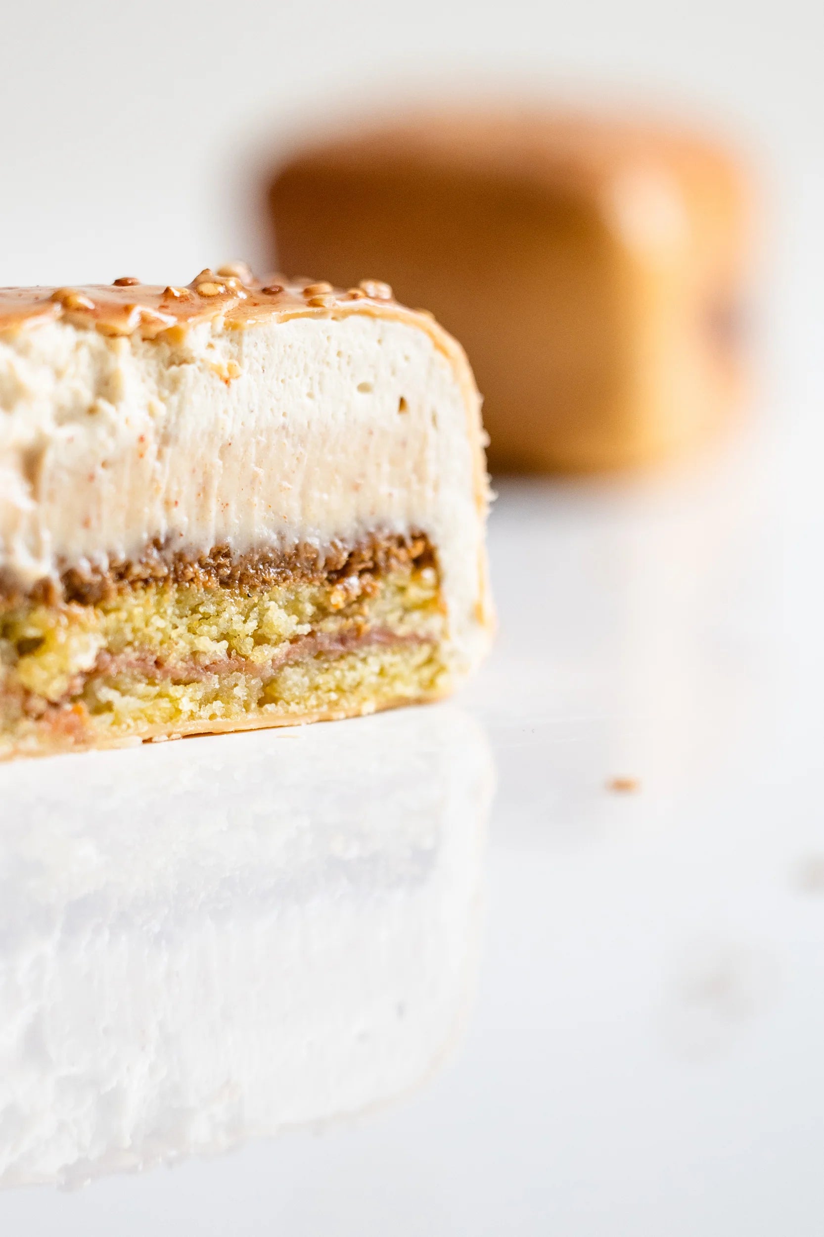 Croustillant praliné sésame blanc. Crémeux aux dattes. Ganache au sésame blanc.